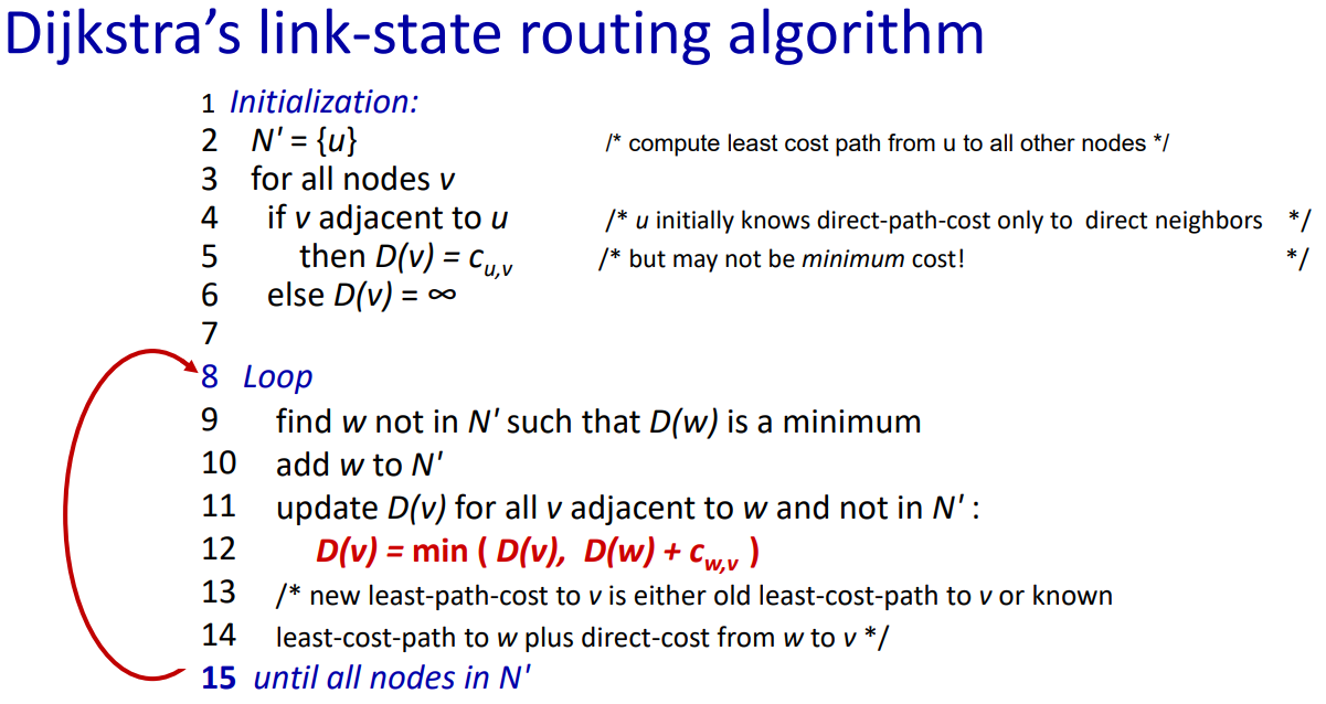 다음은 반복문이다. N'에 속해 있지 않은 w에 대해 D(w)가 최소인 경로 비용을 찾고, 이를 N'에 추가한다.