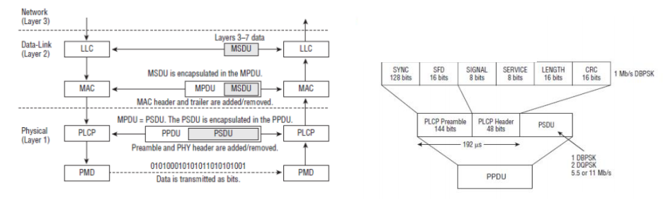 IEEE 802.11에서는 물리 계층과 링크 계층을 각각 한 번씩 더 나누어 아래와 같은 sublayer를 만들어 사용한다. 형태는 다음을 참고하자.