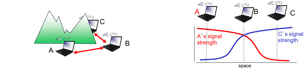 다음과 같이 A와 C가 B라는 ap에 의해서만 연결되고 둘은 산과 같은 지형에 의해 가려져 있다고 하자. 위에서 본 전파의 특성에 의해 A와 C의 신호 세기 그래프는 서로에게 도달하기 어렵다.