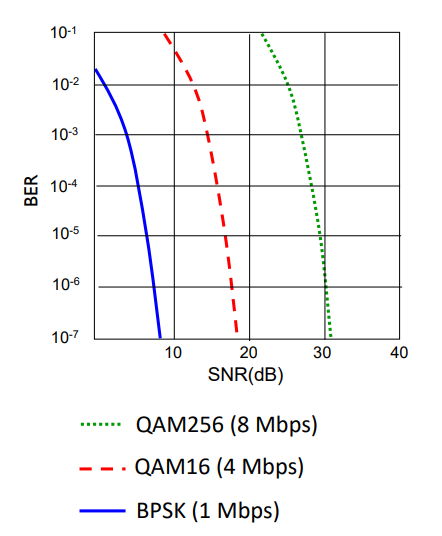 위의 그래프를 보면 QAM이 높을수록 낮은 에러를 위해 더 높은 SNR이 필요하다. 하지만 그만큼 더 강력한 파워가 필요하고