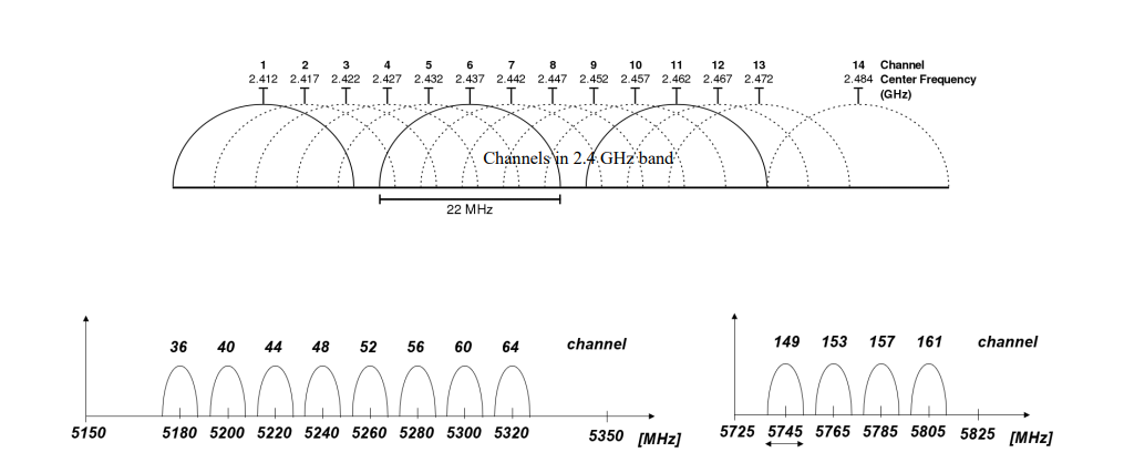 밖에서 통신에 대한 광고를 보면 2.4GHz와 5GHz 대역폭에 대한 것을 많이 보았을 것이다. 이들의 frequency domain 그래프를 보면 아래와 같다.