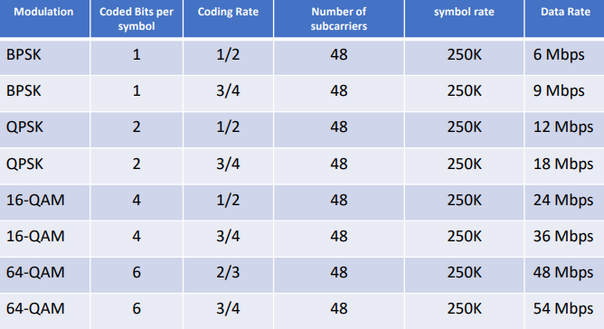 Data rate = bits per symbol * coding rate * 서브캐리어 수 * symbol rate