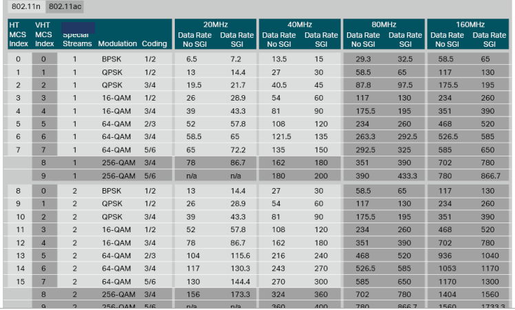 802.11n에서 MIMO가 처음 적용이 되고 WiFi 5라 불리우는 802.11ac의 성능표를 보자.